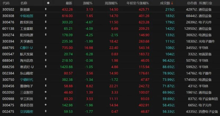 个股涨跌互现,共计2435只个股收涨,涨停股60只;2844只个股收跌,跌停股11只。8只个股日成交额超过100亿元,CPO(共封装光学)概念龙头仍是资金主攻方向,新易盛收涨3.13%报432.26元/股,中际旭创收涨1.65%报616元/股,天孚通信收跌1.99%报235.36元/股。新股摩尔线程今日收涨16.98%报735元/股,日成交额为108亿元,最新总市值为3455亿元。胜宏科技、工业富联、阳光电源跌幅均超过4%,航天发展跌逾6%。